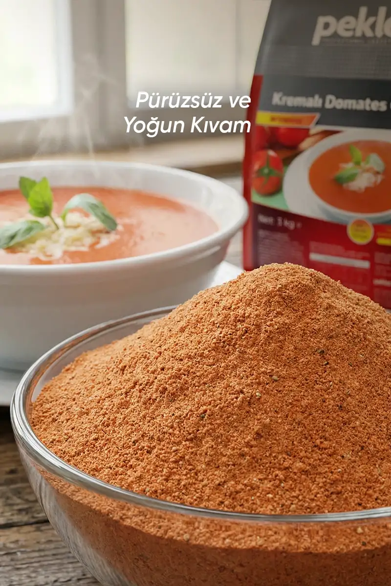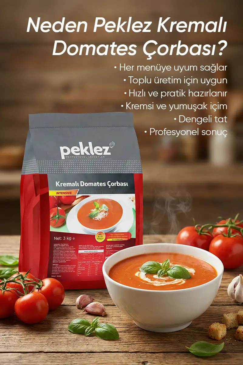 Peklez Kremalı Domates Çorbası, klasik lezzeti pratik kullanım avantajıyla bir araya getirir. Yoğun mutfak temposunda hızlı ve standart üretim yapmak isteyen işletmeler için ideal bir çözümdür.